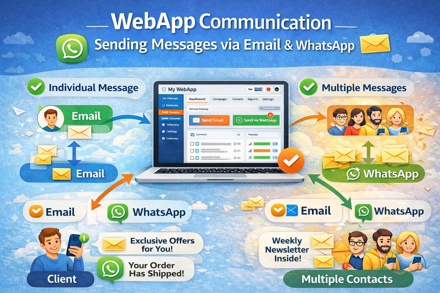 Send emails and WhatsApp messages to your clients for free.